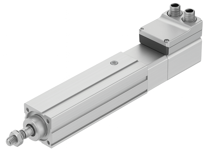 Este cilindro combina un motor paso a paso brushless con un pistón neumático, permitiendo posicionamiento absoluto y regulación de fuerza mediante control eléctrico. Fabricado en aluminio anodizado y vástago de acero endurecido, ofrece recorridos de 20 mm a 400 mm y mando digital vía PLC o interfaz RS-485.